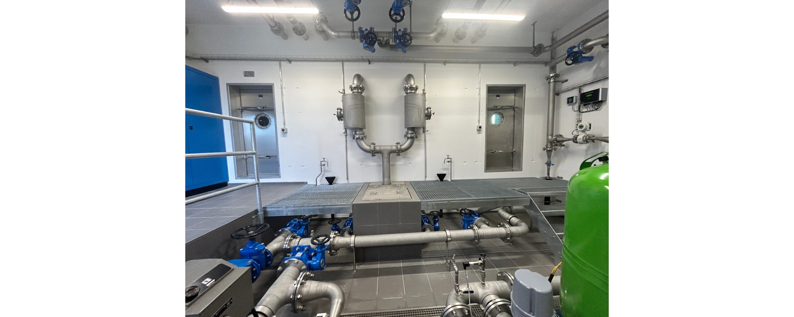 Ab der Brunnenstube fliesst das Trinkwasser im freien Gefälle durch die UV- Anlage in die Reservoirkammern. Mit einem Bypass besteht die Möglichkeit, dass das Trinkwasser ab der Quellfassung direkt über die Brunnenstube zum Quellwasserpumpwerk fliesst.