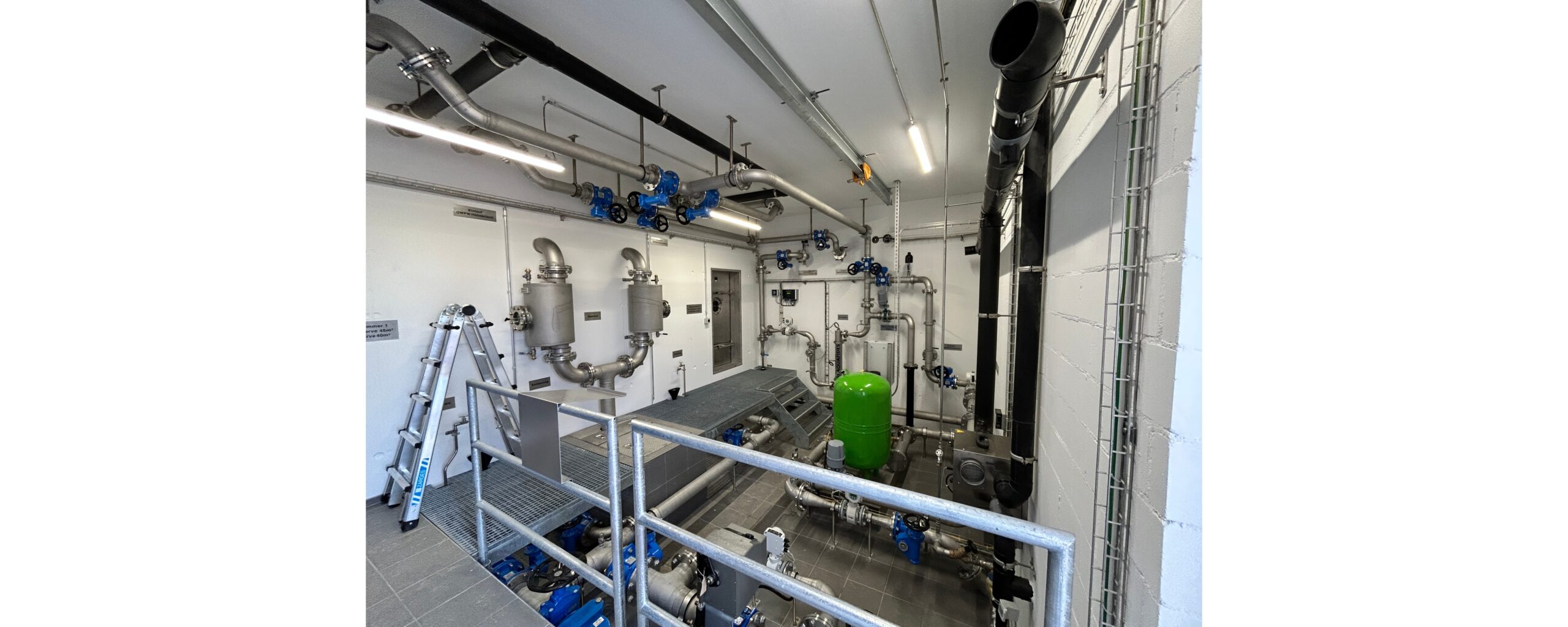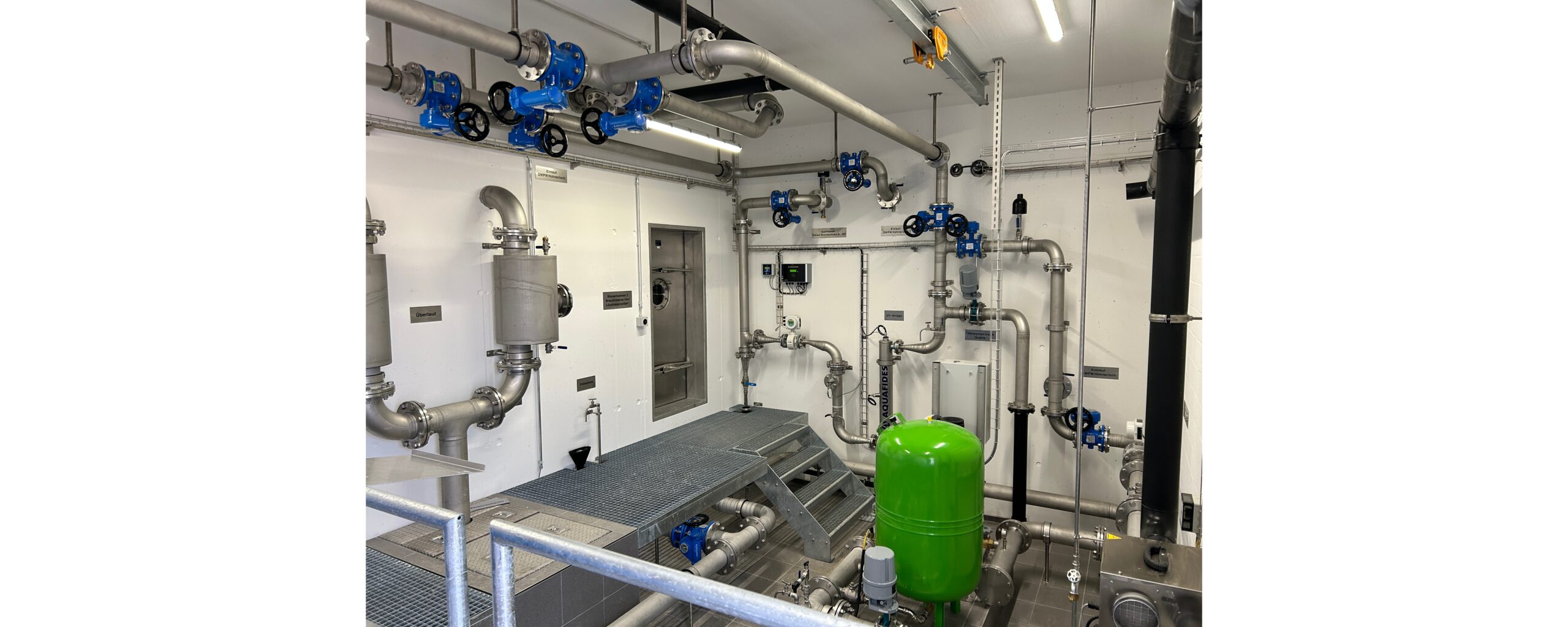 Ab der Brunnenstube fliesst das Trinkwasser im freien Gefälle durch die UV- Anlage in die Reservoirkammern. Mit einem Bypass besteht die Möglichkeit, dass das Trinkwasser ab der Quellfassung direkt über die Brunnenstube zum Quellwasserpumpwerk fliesst.